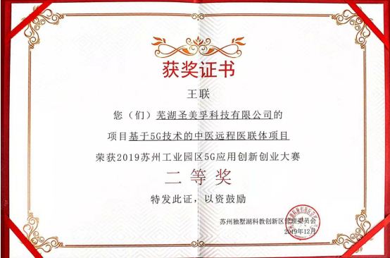 蕪湖圣美孚科技公司以“基于5G技術的中醫遠程醫聯體項目”參加此次大賽,與參賽的各種人工智能、大數據和物聯網等5G示范應用場景的高新科技項目同臺亮相,于決賽現場進行了路演,闡述了基于5G技術的中醫遠程醫聯體項目成果并接受大賽評委的評審問答,經過一番角逐,我公司參賽的“基于5G技術的中醫遠程醫聯體項目”榮獲2019年蘇州工業園區5G應用創新創業大賽二等獎。